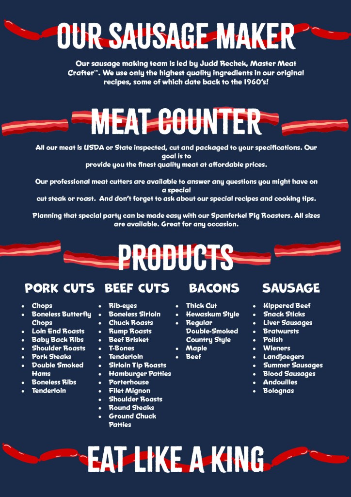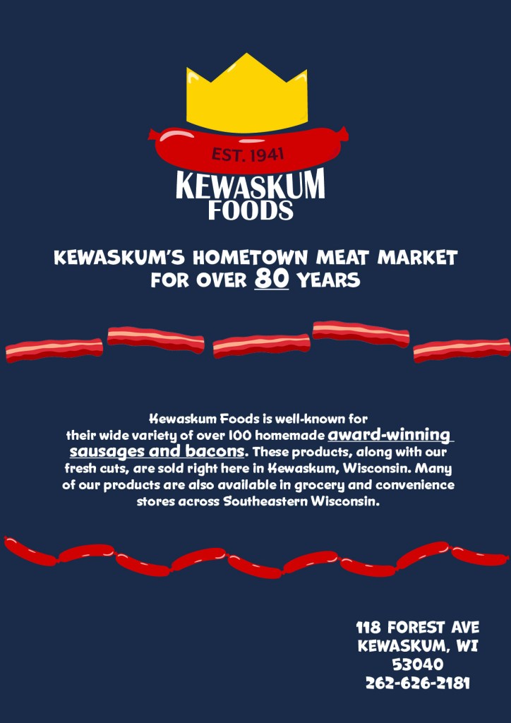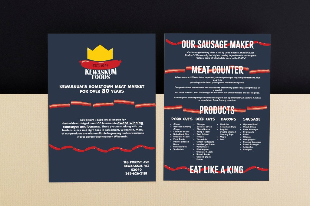 Kewaskum Foods is a meat market located in Kewaskum, WI. My role is to create a brochure for the company. The company needed uplifting, so I wanted created a friendly and playful brochure people would like to look at. I chose to make bacon strips and sausages to separate different categories within the piece. I added work clothes, food wrapping, and even a snapchat filter to represent the brand in a fun way.