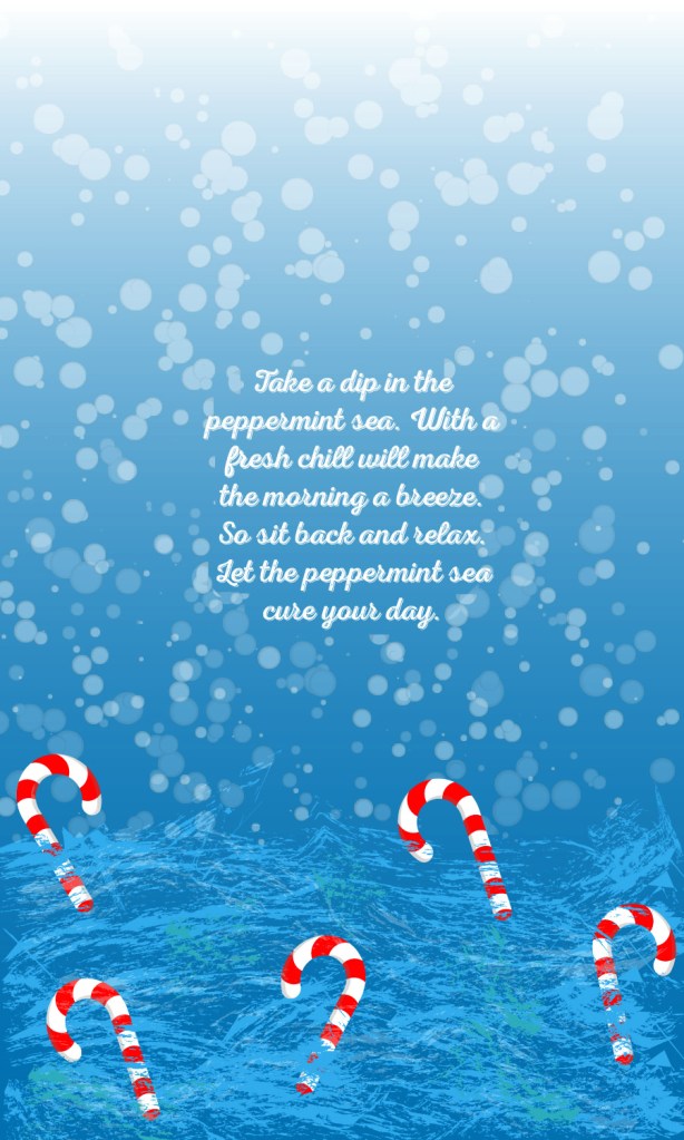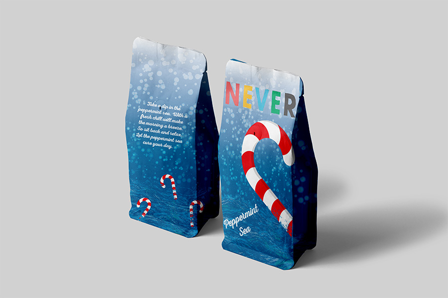 This was for the brand “NEVER” which is a coffee brand. My role is to create a new coffee bean flavor for the company. I wanted to create something that fit within the winter season while reflecting the original brand. I decided on Peppermint Sea which fits the winter vibe and would be a flavor people would enjoy. For the Peppermint Sea I made water at the bottom with candy canes floating around and snow falling from the sky which gave it a friendly/peaceful feeling.